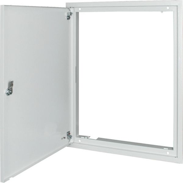 Flush-mounted service distribution board, 3-component flush-mounted door frame IP30, with door, fireproof, BP-U-3S...-EW, steel plate, powder-spray painted, white RAL 9016, outside width 635 mm, outside height 1760 mm, equipment supplied: frames, fireproof door (metal hinges and lock), three-point turn-lock