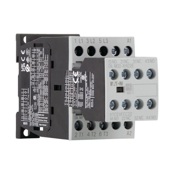 Contactor, Application: Contactors for Motors, Complete devices up to 170 A, Utilization category: AC-1: Non-inductive or slightly inductive loads, resistance furnaces, NAC-3: Normal AC induction motors: starting, switch off during running, AC-4: Normal AC induction motors: starting, plugging, reversing, inching, Connection technique: Screw terminals, Notes: Also suitable for motors with efficiency class IE3., IE3-ready devices are identified by the logo on their packaging., Rated operational current AC-3 380 V 400 V: Ie= 7 A, Rated operational current AC-1 Conventional free air thermal current, 3 pole , 50 - 60 Hz Open at 40 °C: Ith =Ie= 22 A, enclosed: Ith= 18 A, Rated operational current AC-1 Conventional free air thermal current, 1 pole open: Ith= 50 A, enclosed: Ith= 45 A, Max. rating for three-phase motors, 50 - 60 Hz AC-3 220 V 230 V: P= 2.2 kW, 380 V 400 V: P= 3 kW, 660 V 690 V: P= 3.5 kW, Max. rating for three-phase motors, 50 - 60 Hz AC-4 220 V 230 V: P= 1 kW, 380 V 400 V: P= 2.2 kW, 660 V 690 V: P= 2.9 kW, Contacts N/O = Normally open: 2 N/O, Contacts N/C = Normally closed: 2 NC, Instructions: Contacts to EN 50 012., Integrated varistor suppressor circuit., with mirror contact., Voltage AC/DC: DC operation
