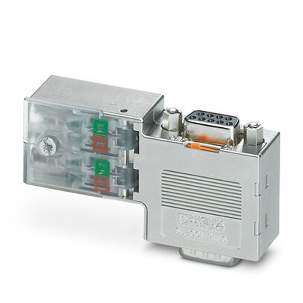 D-SUB connector, 9-pos., male connector, 90° cable entry, bus system: PROFIBUS DP up to 12 Mbps with PG D-SUB socket for connecting a programming device, termination resistor can be switched on via slide switch, pin assignment: 3, 5, 6, 8; IDC terminal block connection