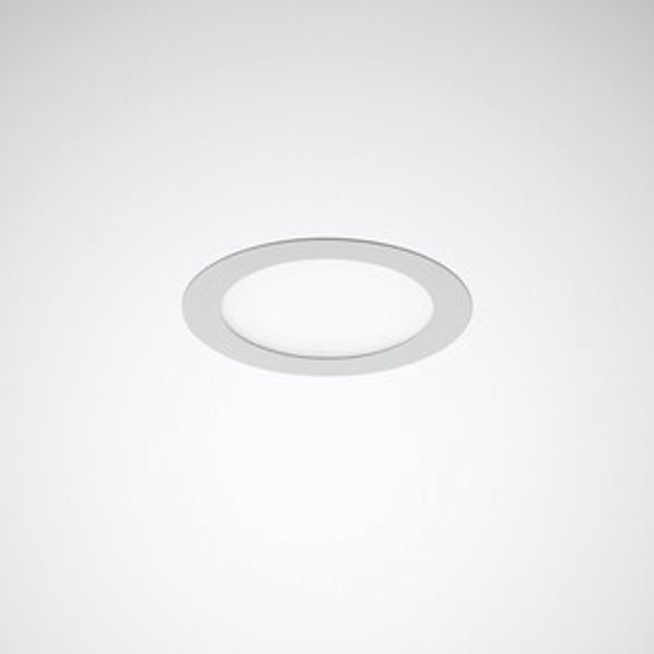 Round LED recessed downlight. Tool-free ceiling installation via rapid-mounting springs. Cut-out opening Ø 168 mm, Recess depth 45 mm. With opal PMMA cover. With Lambertian light distribution. Luminaire luminous flux and light color fixed. Luminaire luminous flux 1300 lm, connected load 15 W, maximum luminous efficiency of luminaire 87 lm/W. Light colour warm white, correlated colour temperature (CCT) 3000 K, general colour rendering index (CRI) Ra > 80. Colour locus tolerance (initial MacAdam) ≤ 4 SDCM. Mean rated service life L80(tq 25 °C) = 50,000 h. Luminaire body of die-cast aluminium. Ceiling ring powder-coated white (RAL 9016). External dimensions of ceiling ring Ø 180 mm, luminaire height 24 mm. Permissible ambient temperature (ta): -20 °C - +25 °C. Safety class (EN 61140): II, protection rating (DIN EN 60529): IP20, Protection rating on room side: IP54, impact resistance level in accordance with IEC 62262: IK05, testing temperature of wire glow test in accordance with IEC 60695-2-11: 650 °C. Weight: 0,4 kg. With external operating device, digitally dimmable (DALI). Control gear unit according to DALI-2 standard (EN 62386). Luminaire is switchable and dimmable by means of touch functionality via DALI control terminals (Touch DIM). The control gear unit is replaceable in accordance with the ecodesign requirements (VO (EU) 2019/2020). The luminaire complies with the fundamental requirements of applicable EU regulations and product safety legislation and bears the CE symbol. The luminaire is also ENEC-certified by an independent testing authority.