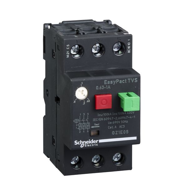 GZ1 E are 3 poles 3d thermal-magnetic circuit breakers specifically designed for the control and protectin of motors conforming to standards IEC 60947-2 and IEC 60947-4-1. Setting range of thermal trips is 0.63-1A with thermomagnetic trip unit. It provides IP 41 in GV2 MC01 enclosure and IP 55 in GV2 MC02 enclosure protection. It procures standard reliability and durability with 0.1 Mcycles electrical/mechanical durability. These circuit breakers are designed for connection by screw clamp terminals. Available worldwide, it is multi-standards certified (IEC, UL, CSA, CCC, EAC, Marine) and Green Premium compliant (RoHs/Reach).