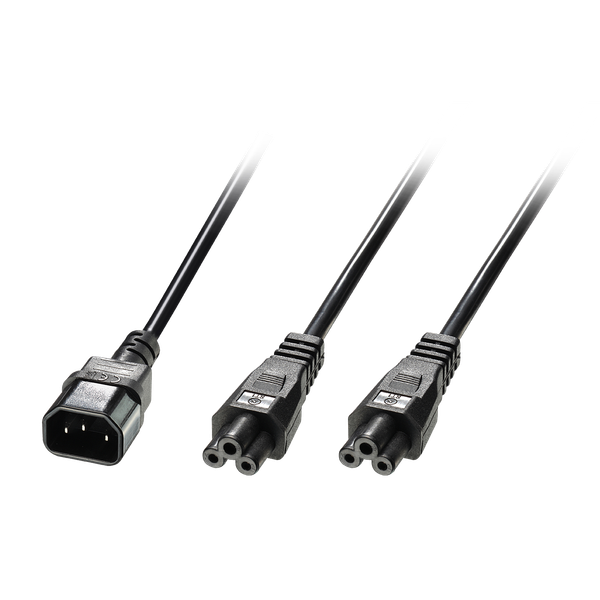 IEC C14 to 2x IEC 5 Mains Cable for use in professional areas and private sectors Provides max. 2.5A/250V to a device Robust PVC/PBT housing and PVC cable jacket, lead-free connectors (<0.1% lead in brass) High temperature resistance allows the cable to be used in non air-conditioned areas 10 year warrantyLindy Power Cables are high quality, reliable power delivery connections for use in a wide variety of professional and home environments.This splitter cable is ideal for powering multiple devices from one power source.The IEC C14 connector fits to many devices with IEC C13 ports and is widely used in the IT-, Audio-, Video- and Event sector. The C5 (Mickey Mouse) connector is ideal for the connection of a notebook power supply.The brass used in the connectors has a lead content of far below 0.1% and is therefore SVHC-free, as are all other materials used in these cables.Please note that this cable is for use in dry areas only.