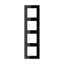 4-gang raam lülitite või pistikupesade paigaldamiseks elamu- või ärihoonete elektrisüsteemides. Võimaldab mitme seadme korralikku paigaldamist ühe raami sisse. Must värv, läikiv viimistlus, valmistatud plastikust (duroplast). Laius: 84 mm.Kõrgus: 297 mm. Sügavus: 10 mm. Toetab horisontaalset ja vertikaalset paigaldamist; horisontaalsete seadmete arv 1, vertikaalsete seadmete arv 4. RAL-number sarnane 9005 (must). Sobib seinakanalisse paigaldamiseks ja sisseehitatud seadmetesse, kuid paigaldusvõre ja ruum siltide/teabepindade jaoks ei ole kaasas. Valmistatud halogeenivabast materjalist, millele on tootmisprotsessi käigus lisatud muud pinnakaitseomadused.