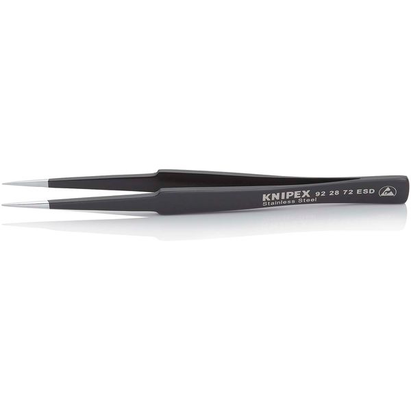 92 28 72 ESD Universal Tweezers ESD Electrically dissipative coating: Universal tweezers in the ESD version equalize differences in electrical potential between their user and the workpieces in a controlled manner. ESD-tested, black epoxy resin coating with a surface resistance between 10^3 and 10^9 ohms. For the electronics and precision engineering industries. Antimagnetic to avoid electromagnetic damage. Wide range of designs: straight, angled, gripping surfaces and handles smooth or serrated, with needle points, narrow or blunt tips. The high quality stainless steel ensures extreme toughness and very good corrosion resistance against a variety of atmospheric environments and many corrosive materials. Also available as a set (92 00 01 ESD). - Surface: matt finish- Finish: straight- Tips width (A): 0.4mm- Tips width (B): 0.5mm- Corrosion-resistant: yes - Acid resistance: very good- ESD-tested: yes - VDE tested: no - Sectors: electronics- Magnetic: non-magnetisable (80%)- Behaviour: electrically dissipative