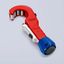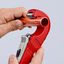 90 31 02 BK KNIPEX TubiX® Pipe cutter QuickLock one-hand locking mechanism: independent holding and clamping on the tube. Easy one-handed pushing for quick adjustment to different tube sizes. Comfortable: easy cutting due to high-quality needle bearings in the cutting wheel and guide rolls. Cuts pipes from Ø 6 - 35 mm (1/4" - 1 3/8") with wall thickness up to 2 mm. Cutting wheel made of high-grade ball-bearing steel. Quick replacement of the cutting wheel without any tools — spare cutting wheel stored in the handle. Removable, precision-ground deburring tool. For the electric trade: Also suitable to cut rigid steel conduits. self-service card/blister. - Cutting capacities (diameter): Ø 6 – 35mm- Cutting capacities (diameter): Ø 1/4 – 1 3/8in