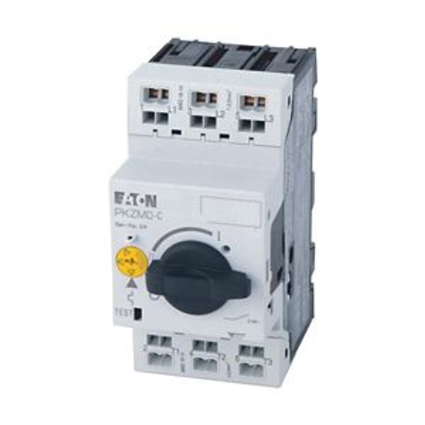 Motor-protective circuit-breaker according to IEC/EN60947, 3 pole size PKZM0, with adjustable overload and non-delayed short-circuit release, phase failure sensitive, screw and snap fitting, with spring-cage terminals, cap installation dimension 45mm, rated operating voltage Ue 690V, degree of protection IP20, finger proof according to VDE 0106 T. 100, accessories: auxiliary contact, voltage release, contact module, clip plate