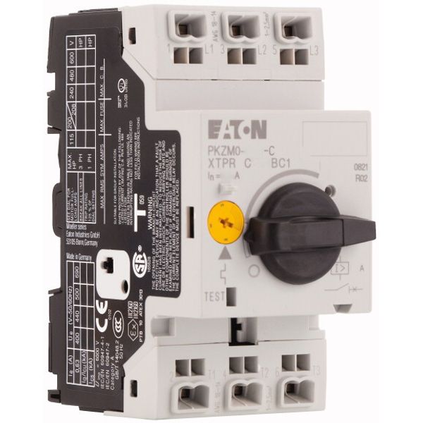 Motor-protective circuit-breaker according to IEC/EN60947, 3 pole size PKZM0, with adjustable overload and non-delayed short-circuit release, phase failure sensitive, screw and snap fitting, with spring-cage terminals, cap installation dimension 45mm, rated operating voltage Ue 690V, degree of protection IP20, finger proof according to VDE 0106 T. 100, accessories: auxiliary contact, voltage release, contact module, clip plate