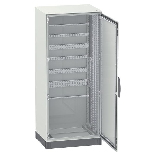 Spacial SF side entry rail - width 800 mm. Enclosure width is 800 mm. Multi-purpose mounting accessory. Mounting on bottom of enclosure, in width. Destined for mounting plates in coupled enclosures. Adjustable in depth every 25 mm. Steel made, zinc coated surface finish. 2 rails and fixing elements incl.