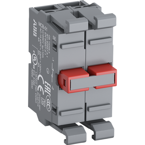 The MCB-02 Contact Block is: Without holder - Non-illuminated - Double contact block - Front mounting - silver (Ag) - 2 NO - 2NC - 690 V