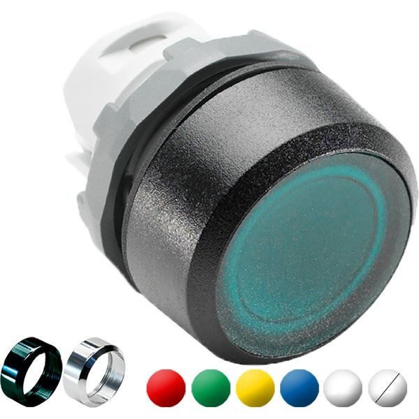 The MP1-7144 Pushbutton is: Maintained - Flush - Blue - non-Illuminated - Black Plastic - No contact block