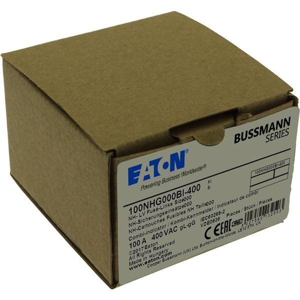 Fuse, fuse-link, low voltage, 100 A, AC 400 V, NH000, gL/gG, IEC, dual (combination) indicator system, square-body with knife blade contacts, live gripping lugs, IEC 60269-2 fuse system A, DIN 43620, VDE 0636-2. Breaking capacity 120 kA