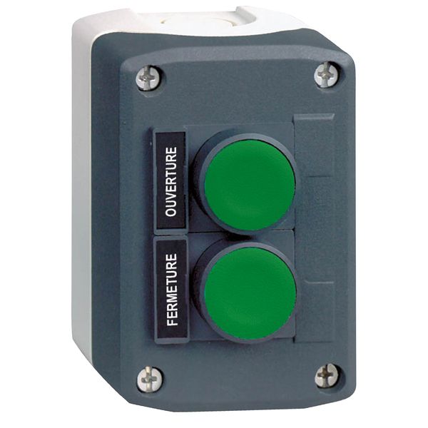 Complete control station, Harmony XALD, dark grey green flush/Red flush pushbuttons Ø22 mm spring return |