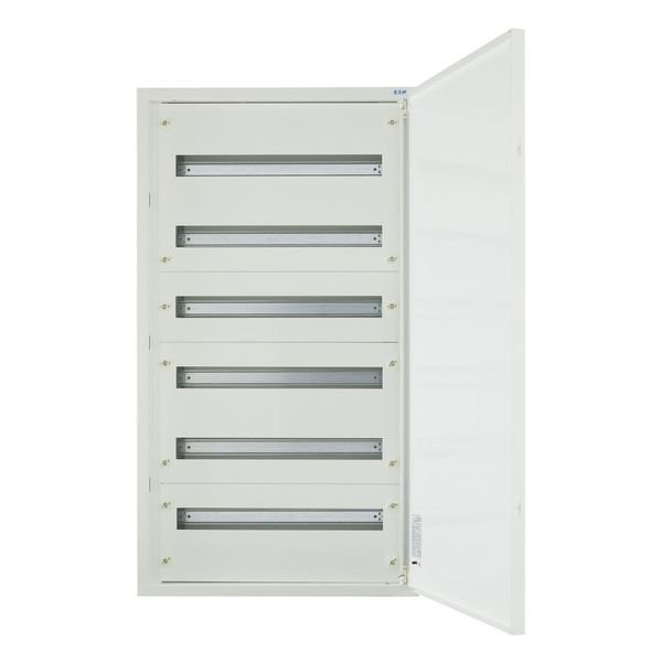 Complete BF-U-./..-C flush-mounted distribution board, white RAL 9016, 24 space units per row, 6 rows, height 1070mm, width 588 mm, depth 136 mm, including door, front plates, DIN-rail mounting frame and neutral/PE terminals. Enclosure: closed design, including back plate, back plate can be used as a fixing plane, 2 cable gland plate inserts for slim distribution boards with a width of 24 space units, top, knockout cable entry openings on the bottom, terminals pre-assembled on enclosure (no loss of space units). Wall trough with door frame, back plate can be used as a fixing plane, cable entry openings that are easy to knock out , 127 mm depth, terminals pre-assembled on enclosure (no loss of space units), 4 side fixing brackets. Sheet steel door with cam lock included as standard, sheet steel door with expanded depth (required, for example, in order to install RMQ components in the door) (BFZ-OTR-./...) is available as an accessory. Removable DIN-rail mounting frame, for 45 mm modular installation devices, 150 mm DIN busbar distance, Eaton circuit-breakers can be integrated with installation kit , a universal mounting plate can be installed using an installation kit for flush-mounted enclosures (BFZ-U-MPL..). electrical contact for metal front plate achieved with special lock on enclosure