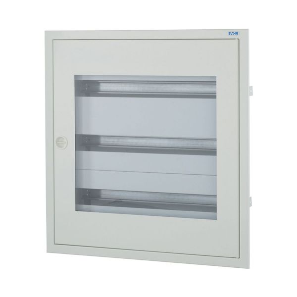 Complete BF-U-./..-C flush-mounted distribution board, white RAL 9016, 24 space units per row, 3 rows, height 620mm, width 588 mm, depth 136 mm, including door and transparent panel, front plates, DIN-rail mounting frame and neutral/PE terminals. Enclosure: closed design, including back plate, back plate can be used as a fixing plane, 2 cable gland plate inserts for slim distribution boards with a width of 24 space units, top, knockout cable entry openings on the bottom, terminals pre-assembled on enclosure (no loss of space units). Wall trough with door frame, back plate can be used as a fixing plane , cable entry openings that are easy to knock out, 127 mm depth, terminals pre-assembled on enclosure (no loss of space units), 4 side fixing brackets. Sheet steel door with cam lock and transparent panel included as standard, sheet steel door with expanded depth (required, for example, in order to install RMQ components in the door) (BFZ-OTR-./...) is available as an accessory. Removable DIN-rail mounting frame, for 45 mm modular installation devices, 150 mm DIN busbar distance, Eaton circuit-breakers can be integrated with installation kit , a universal mounting plate can be installed using an installation kit for flush-mounted enclosures (BFZ-U-MPL..). electrical contact for metal front plate achieved with special lock on enclosure