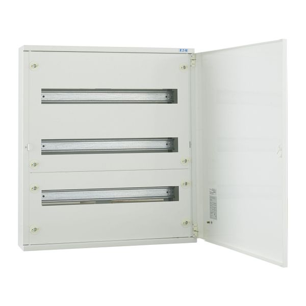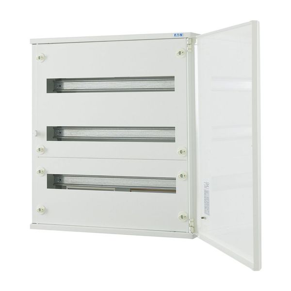 Complete BF-O-./..-C surface-mounted slim distribution board, white RAL 9016, 24 space units per row, 3 rows, height 600mm, width 543 mm, depth 140 mm, including door, front plates, DIN-rail mounting frame and neutral/PE terminals. Enclosure: closed design, including back plate, back plate can be used as a fixing plane, 2 cable gland plate inserts for slim distribution boards with a width of 24 space units, top, knockout cable entry openings on the bottom, terminals pre-assembled on enclosure (no loss of space units). Wall trough with door frame, back plate can be used as a fixing plane, cable entry openings that are easy to knock out , 127 mm depth, terminals pre-assembled on enclosure (no loss of space units), 4 side fixing brackets. Sheet steel door with cam lock included as standard, sheet steel door with expanded depth (required, for example, in order to install RMQ components in the door) (BFZ-OTR-./...) is available as an accessory. Removable DIN-rail mounting frame, for 45 mm modular installation devices, 150 mm DIN busbar distance, Eaton circuit-breakers can be integrated with installation kit , a universal mounting plate can be installed using an installation kit for surface-mounted enclosures (BFZ-O-ITMPL..). electrical contact for metal front plate achieved with special lock on enclosure