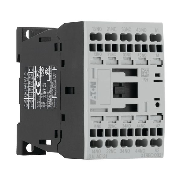 Contactor relay, Product range: DILA relays, Application: Contactor relays, Description: Basic devices with positive operation contacts, Connection technique: Spring-loaded terminals, Rated operational current AC-15 220 V 230 V 240 V: Ie= 4 A, 380 V 400 V 415 V: Ie= 4 A, Contacts N/O = Normally open: 3 N/O, Contacts N/C = Normally closed: 1 NC, Code number and version of combination Distinctive number: 31E, Can be combined with auxiliary contact module: DILA-XHIC(V)…, Actuating voltage: 24 V 50/60 Hz, Voltage AC/DC: AC operation, Degree of Protection: IP20, Instructions: Contact numbers to EN 50011, Coil terminal markings to EN 50005 , Standards: IEC/EN 60947, EN 60947-5-1, VDE 0660, UL, CSA