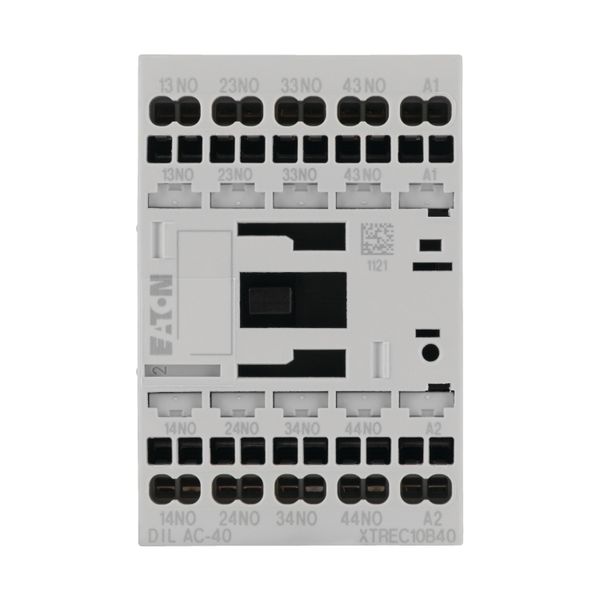 Contactor relay, Product range: DILA relays, Application: Contactor relays, Description: Basic devices with positive operation contacts, Connection technique: Spring-loaded terminals, Rated operational current AC-15 220 V 230 V 240 V: Ie= 4 A, 380 V 400 V 415 V: Ie= 4 A, Contacts N/O = Normally open: 4 N/O, Code number and version of combination Distinctive number: 40E, Can be combined with auxiliary contact module: DILA-XHIC(V)…, Actuating voltage: 24 V DC, Voltage AC/DC: DC operation, Degree of Protection: IP20, Instructions: Contact numbers to EN 50011, Coil terminal markings to EN 50005, built-in suppressor circuit' , Standards: IEC/EN 60947, EN 60947-5-1, VDE 0660, UL, CSA