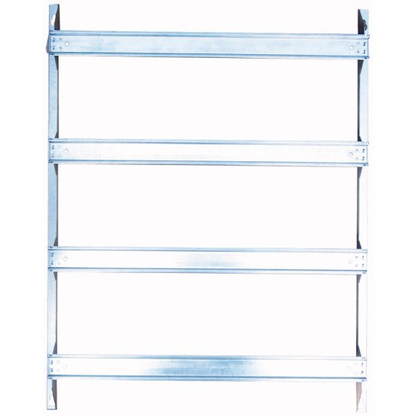 DIN rail mounting frame, BFZ-DINS, removable DIN-rail frame, for 45 mm modular installation devices, 4-rows, 24 space units per row, 150 mm DIN busbar spacing. Eaton circuit-breakers can be integrated with installation kit (BFZ-NZM1-SET(/33)), a universal mounting plate can be installed using an installation kit for surface-mounted enclosures (BFZ-O-ITMPL..), as well as using an installation kit for flush-mounted enclosures (BFZ-U-MPL..) , galvanized sheet steel