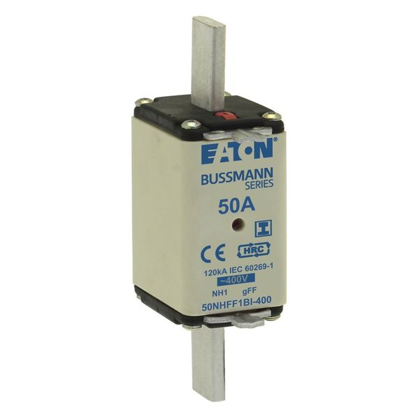 | Gamintojo pavadinimas | Fuse-link, LV, 50 A, AC 400 V, NH1, gFF, IEC, dual indicator, insulated gripping lugs |