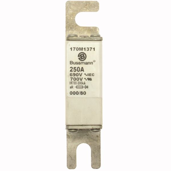 Fuse, Fuse-link, high speed, 250 A, AC 690 V, DIN 000, 21 x 40 x 100 mm, aR, DIN, IEC, single indicator, square body with offset bolted tags (slotted), semiconductor protection, DIN 43653, IEC 60269-4, Breaking Capacity 200 kA