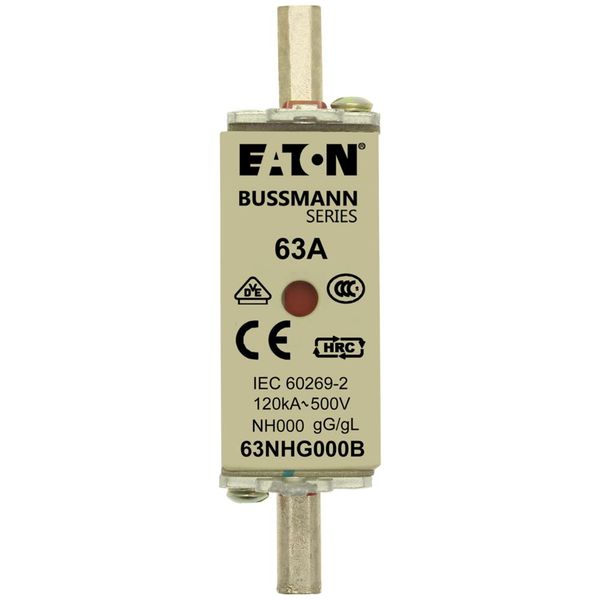| Gamintojo pavadinimas | Fuse-link, LV, 63 A, AC 500 V, NH000, gL/gG, IEC, dual indicator, live gripping lugs |