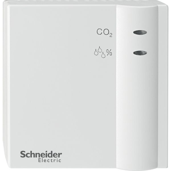 KNX CO2, humidity and temperature sensor AP. The device is a combined sensor for CO2, temperature and humidity measurement (relative humidity). It is used to monitor the air quality in meeting rooms, offices, schools/kindergartens, passive or low-energy houses and living areas without controlled ventilation. The CO2 content of the air is a verifiable indicator of the ambient air quality. The higher the CO2 content, the worse the ambient air is. KNX software functions: Threshold adjustment range: 500-2550 ppm. Object Physical value: 0-9999 ppm. There are 3 independent measured value thresholds for CO2 and relative humidity and a threshold for the temperature value. An action is carried out if the thresholds are not reached or if they are exceeded: Send priority. Switching, value. Each threshold has a locking object. Power supply: bus voltage. Current consumption from bus: max. 10 mA. Ambient temperature: -5 °C-+45 °C. Measuring range, CO2: 300 - 9999 ppm. Measuring range, temperature: 0 °C-+40 °C. Measuring range, humidity: linear 20 %-100 %. Type of protection: IP 20 in accordance with DIN EN 60529. Dimensions: 74x74x31 mm. Colour: polar white.