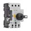 Motor-protective circuit-breaker with lockable rotary handle to IEC/EN60947, 3 pole size PKZM0, with adjustable overload and non-delayed short-circuit release, phase failure sensitive, screw and snap fitting, with screw terminal, cap installation dimension 45mm, rated operating voltage Ue 690V, degree of protection IP20, finger proof according to VDE 0106 T. 100, accessories: auxiliary contact, voltage release, contact module, clip plate
