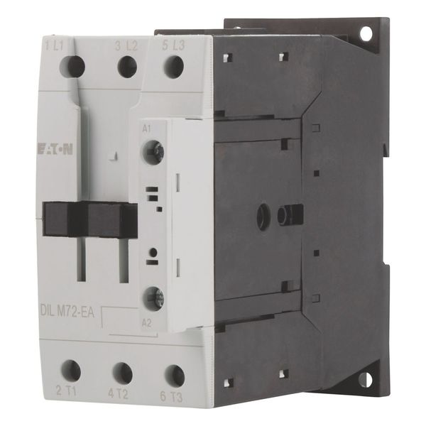 Contactor, Application: Contactors for Motors, Contactors up to 170 A, 3 pole, Utilization category: AC-1: Non-inductive or slightly inductive loads, resistance furnaces, NAC-3: Normal AC induction motors: starting, switch off during running, AC-4: Normal AC induction motors: starting, plugging, reversing, inching, Connection technique: Screw terminals, Notes: Not suitable for motors with efficiency class IE3., Number of poles: 3 pole, Rated operational current AC-3 380 V 400 V: Ie= 72 A, Rated operational current AC-1 Conventional free air thermal current, 3 pole, 50 - 60 Hz Open at 40 °C: Ith =Ie= 98 A, enclosed: Ith= 72 A , Rated operational current AC-1 Conventional free air thermal current, 1 pole open: Ith= 200 A, enclosed: Ith= 180 A, Max. rating for three-phase motors, 50 - 60 Hz AC-3 220 V 230 V: P= 22 kW, 380 V 400 V: P= 37 kW, 660 V 690 V: P= 35 kW, Max. rating for three-phase motors, 50 - 60 Hz AC-4 220 V 230 V: P= 7 kW, 380 V 400 V: P= 12 kW, 660 V 690 V: P= 17 kW, Can be combined with auxiliary contact: DILM150-XHI(V)…, DILM1000-XHI(V)…, Instructions: Contacts to EN 50 012., integrated suppressor circuit in actuating electronics, Observe electrical lifespan., Voltage AC/DC: DC operation