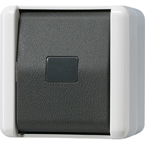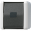 Izmanto, lai kontrolētu elektrības plūsmu ķēdē. Viena pogas nospiešana ieslēdz/izslēdz. Virsmas montāža, piemērota IP44 klasifikācijai. 10 AX nominālā strāva, nominālais spriegums 250 V. Materiāls: termoplastiska, halogēnu nesaturoša plastmasa, spīdīga apdare RAL 7035 pelēka. Montāžas izkārtojums ar pilnīgu korpusu; stiprinājuma veids ir skrūvju montāža.Izmēri: ierīces platums 75 mm, augstums 75 mm, dziļums 58 mm. Polu skaits 1. Darbības princips: šūpojošs. Ietver apgaismojuma funkciju, bet nav signāllampas vai atgriezeniskā signāla kontakta vai uzraksta (nav).