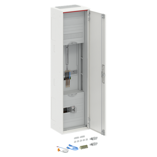 Meter board, series ComfortLine A, fully assembled cabinet, with Metering cross, Expansion option: Lateral, for the internal use, with Door, class of protection II (double insulated), degree of protection IP31, IK code 7, Rated operational voltage 400V AC 50/60 Hz, rated current 63 A, Powder-coated, in RAL 9016, enclosure out of sheet steel, single-leaf door, door out of sheet steel, with Standard closure, door opening angle 120 degree, door hinge right or left, rear wall out of sheet steel / plastic, cable entry on top via membrane flange mounted, on bottom via 1x cable entry flange included, on side via flange opening pre-punched, rear wall cable entry part is pre-punched, dimensions in mm (H x W x D): 1100 x 300 x 215, Metering module pre-wired, Earthing system TN-S, 5-pole, Direct connection, net side compartment, meter space: with busbar, pre-assembled for main switch SH, incoming terminals up to 25 mm², system side compartment, meter space: with Main branch terminal, Number of meter spaces single tariff 1, Grid unit 7 GU, Overall height 3, panel width 1, Space units 84, covers out of Plastic, Quick sealable connection, RAL 7035