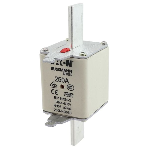 | Ražotāja nosaukums | Fuse-link, LV, 250 A, AC 500 V, NH03, gL/gG, IEC, dual indicator, live gripping lugs |