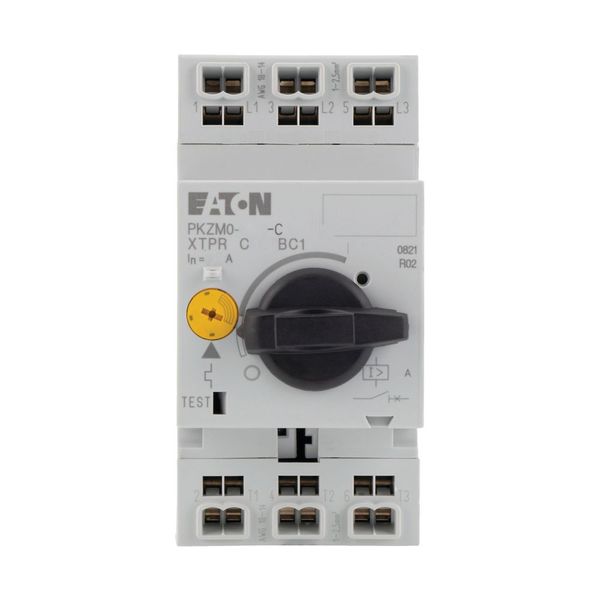 Motor-protective circuit-breaker according to IEC/EN60947, 3 pole size PKZM0, with adjustable overload and non-delayed short-circuit release, phase failure sensitive, screw and snap fitting, with spring-cage terminals, cap installation dimension 45mm, rated operating voltage Ue 690V, degree of protection IP20, finger proof according to VDE 0106 T. 100, accessories: auxiliary contact, voltage release, contact module, clip plate
