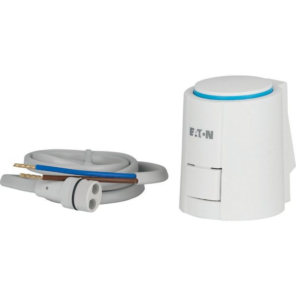 The thermo-electric radiator valve is used to actuate, e.g., radiators, floor heaters, etc. For this purpose, the device is actuated via switching device.