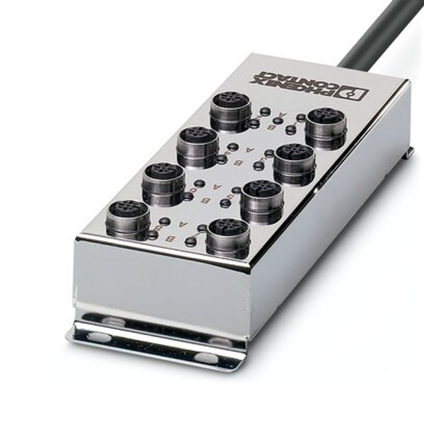 Sensor/actuator box, application: Food processing industry, connection method: M12 socket, number of slots: 8, number of positions: 5, status display: yes; master cable connection: Fixed connection, PVC, cable length: 20 m, shielding: no