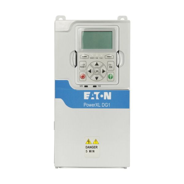 Frequency converter, Part group reference (e.g. DIL): DG1, Rated operational voltage: Ue = 400 V AC, 3-phase, 480 V AC, 3-phase, 500 V AC, 3-phase, Output voltage with Ve: U2 = 400 V AC, 3-phase, 480 V AC, 3-phase, 500 V AC, 3-phase, Mains voltage (50/60Hz): ULN = 380 (-15%) - 500 (+10%) V, Rated operational current At 150% overload: Ie = 4.3 A, Note: Rated operational current for a switching frequency of 1 - 12 kHz and an ambient temperature of +50 °C for a 150% overload and +40 °C for a 110% overload, Rated operational current At 110% overload: Ie = 5.6 A, Note: Overload cycle for 60 s every 600 s , Assigned motor rating Note: for normal internally and externally ventilated 4 pole, three-phase asynchronous motors with 1500 rpm-1 at 50 Hz or 1800 min-1 at 60 Hz, Overload cycle for 60 s every 600 s, at 400 V, 50 Hz, Assigned motor rating 150 % Overload: P = 1.5 kW, 110 % Overload: P = 2.2 kW, 150 % Overload: IM = 3.6 A, 110 % Overload: IM = 5 A, Assigned motor rating Note: at 500 V, 50 Hz, Assigned motor rating 150 % Overload: P = 2.2 kW, 110 % Overload: P = 3 kW, 150 % Overload: IM = 4 A, 110 % Overload: IM = 5.3 A, Assigned motor rating Note: at 480 V, 60 Hz, Assigned motor rating 150 % Overload: P = 2 HP, 110 % Overload: P = 3 HP , Assigned motor rating 150 % Overload: IM = 3.4 A, 110 % Overload: IM = 4.8 A, Degree of Protection: IP20/NEMA0, Interface/field bus (built-in): Modbus RTU, Modbus TCP, BACnet MS/TP, Ethernet IP, Fieldbus connection (optional): PROFIBUS, CANopen®, DeviceNet, SmartWire-DT, Fitted with: Radio interference suppression filter, Additional PCB protection, Multi-line graphic display, Brake chopper, Frame size: FS0, Standards: Specification for general requirements: IEC/EN 61800-2, EMC requirements: IEC/EN 61800-3, Safety requirements: IEC/EN 61800-5