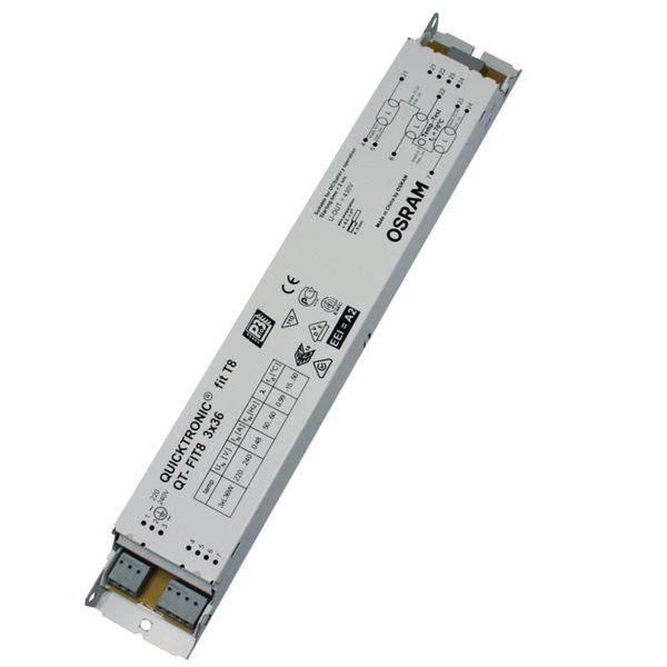 QT-FIT8 3x36—designed for running up to three fluorescent lamps in series. Handles linear setups in lighting systems, operates as ballast+driver combo ensuring stable voltage/current conversion. Compact construction for tight installations with quick wiring slots. Dimensions ~overall minimal impact on housing heat dissipation (unknown specific range). Weight fits typical ceilings/drop panels without issue. Integrated safety circuitry cleans shutdown events, auto restart enabled for load recovery. Input voltages flexible AC mains ~220-240V primary supply only (50/60Hz versatile). Output max spec adjusted to match lamp type between 36W per unit x3. Phase angle correction available but not visible inside tagged components — slight buzzing noted around mid-output limits under heavy loads or weak mains lines input lighting faults? Technical notes: Width 31mm, length approx 360mm casing, weight unknown but light enough single tech small bag equipment fit, output current peak set automatic @ control target parameter calibration system specs dumped all factory presets unchanged?, enclosed non-IP rated build use indoor strict placement requirements!, warranty status no check, high reliability under temperature ranges <45°C operation warning above limits thermal damage possible failure signs "case hot" feel!.