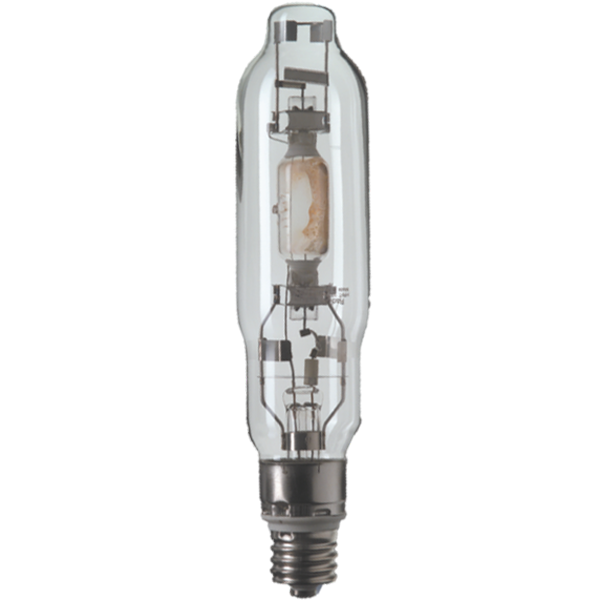 Metal halide lamp with quartz burner, tubular bulb clear, daylight, base E40. Operation in enclosed luminaire, with ballast and ignitor.