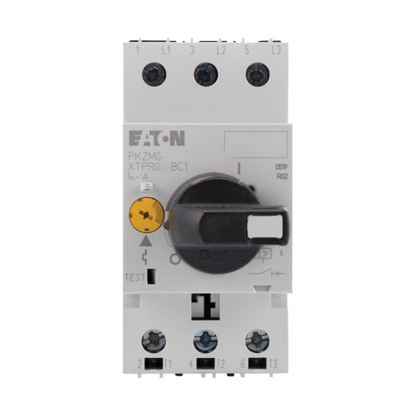 Motor-protective circuit-breaker with lockable rotary handle to IEC/EN60947, 3 pole size PKZM0, with adjustable overload and non-delayed short-circuit release, phase failure sensitive, screw and snap fitting, with screw terminal, cap installation dimension 45mm, rated operating voltage Ue 690V, degree of protection IP20, finger proof according to VDE 0106 T. 100, accessories: auxiliary contact, voltage release, contact module, clip plate