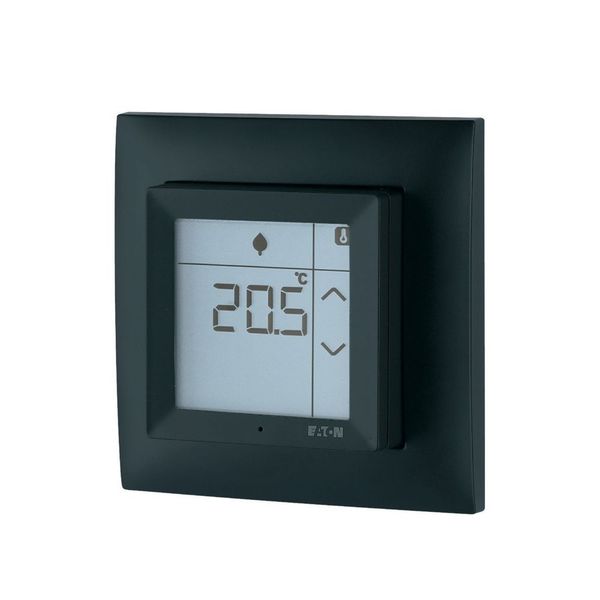 Room Controller Touch complete with frame, jet black matt, and with temperature and humidity sensor is suitable to monitor and control the climate in a room either stand-a-lone or together with an intelligent device. The operation is done through the Touch display with backlight. The user programmable Week Program Timer and 4 Operation modes offer maximum flexibility to meet the specific needs. It supports floor temperature control via an optional external wired floor temperature sensor (PT1000). Two optional touch-buttons on the display are available to control other xComfort functions/actuators . The Room Controller Touch is compatible with many 55 mm frames from the switch industry (observe the compatibility list). The device is battery powered and NO switch, branch or installation box is required, therefore it can be easily mounted anywhere (screwed and glued). Battery included as standard, but it can also be powered with an optional mains power adapter.