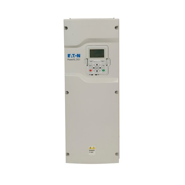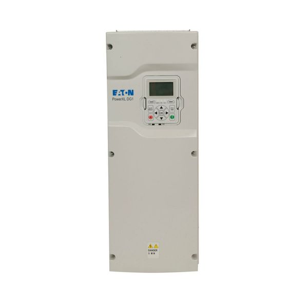 Variable frequency drive, Part group reference (e.g. DIL): DG1, Rated operational voltage: Ue = 400 V AC, 3-phase, 480 V AC, 3-phase, 500 V AC, 3-phase, Output voltage with Ve: U2 = 400 V AC, 3-phase, 480 V AC, 3-phase, 500 V AC, 3-phase, Mains voltage (50/60Hz): ULN = 380 (-15%) - 500 (+10%) V, Rated operational current At 150% overload: Ie = 31 A, Note: Rated operational current for a switching frequency of 1 - 12 kHz and an ambient temperature of +50 °C for a 150% overload and +40 °C for a 110% overload, Rated operational current At 110% overload: Ie = 38 A, Note: Overload cycle for 60 s every 600 s , Assigned motor rating Note: for normal internally and externally ventilated 4 pole, three-phase asynchronous motors with 1500 rpm-1 at 50 Hz or 1800 min-1 at 60 Hz, Overload cycle for 60 s every 600 s, at 400 V, 50 Hz, Assigned motor rating 150 % Overload: P = 15 kW, 110 % Overload: P = 18.5 kW, 150 % Overload: IM = 29.3 A, 110 % Overload: IM = 36 A, Assigned motor rating Note: at 500 V, 50 Hz, Assigned motor rating 150 % Overload: P = 18.5 kW, 110 % Overload: P = 22 kW, 150 % Overload: IM = 28.9 A, 110 % Overload: IM = 33 A, Assigned motor rating Note: at 480 V, 60 Hz, Assigned motor rating 150 % Overload: P = 20 HP , 110 % Overload: P = 25 HP, Assigned motor rating 150 % Overload: IM = 27 A, 110 % Overload: IM = 34 A, Degree of Protection: IP21/NEMA1, Interface/field bus (built-in): Modbus RTU, Modbus TCP, BACnet MS/TP, Ethernet IP, Fieldbus connection (optional): PROFIBUS, CANopen®, DeviceNet, SmartWire-DT, Fitted with: Radio interference suppression filter, Additional PCB protection, Multi-line graphic display, Brake chopper, DC link choke, Frame size: FS3, Standards: Specification for general requirements: IEC/EN 61800-2, EMC requirements: IEC/EN 61800-3, Safety requirements: IEC/EN 61800-5